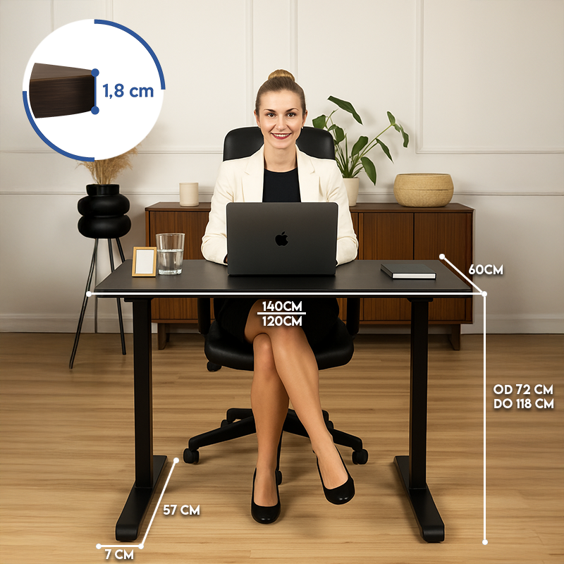 Elektryczne biurko 120×60 cm z płynną regulacją wysokości pozwala szybko zmieniać pozycję z siedzącej na stojącą, poprawiając komfort podczas pracy, nauki i grania. Stabilna konstrukcja i cichy napęd sprawiają, że regulacja jest wygodna i nieuciążliwa. Panel sterowania z wyświetlaczem ułatwia dopasowanie ustawień, a dodatki do organizacji kabli oraz miejsce na słuchawki/plecak pomagają utrzymać porządek. Nowoczesny, minimalistyczny design pasuje do biura i stanowiska gamingowego.