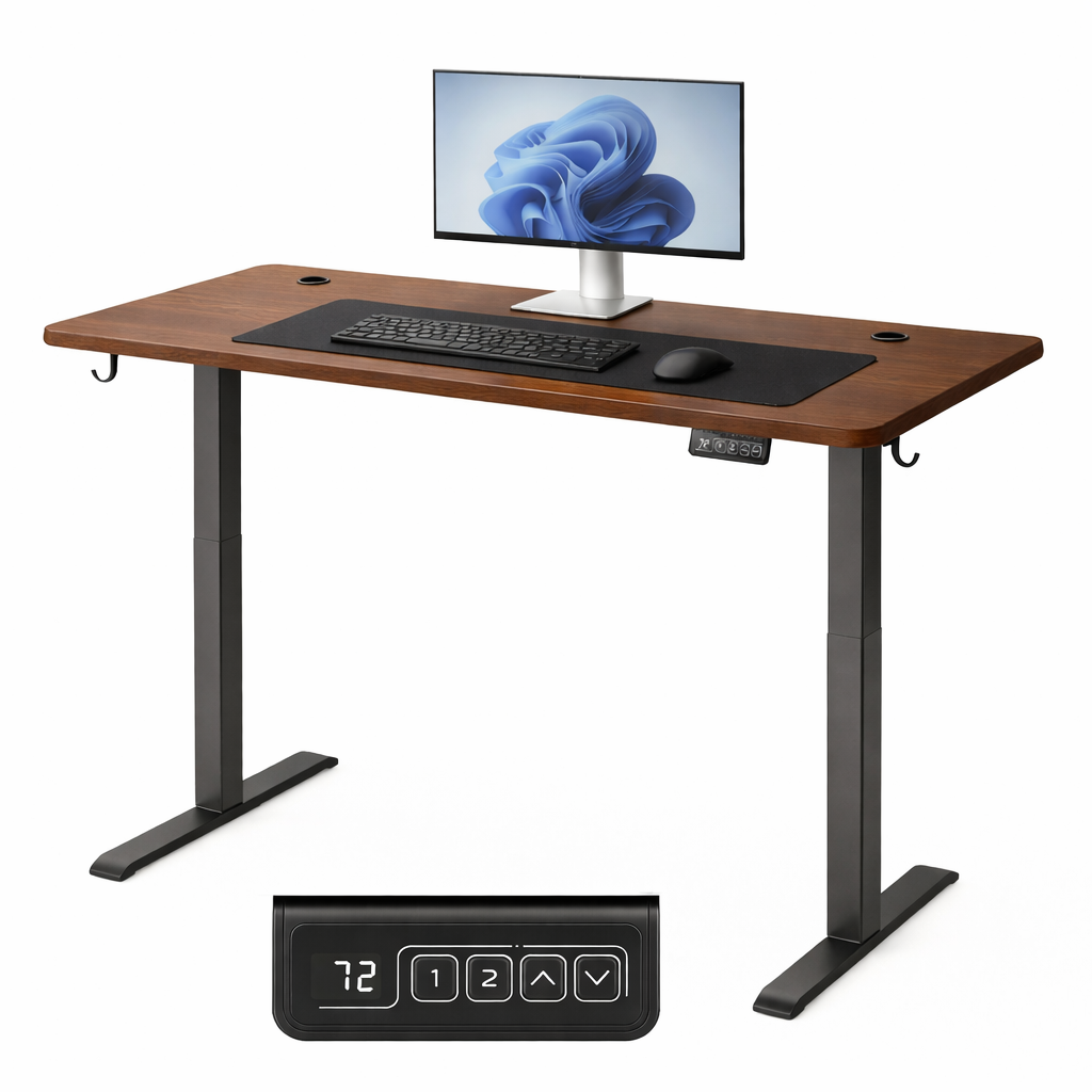 Elektryczne biurko 120×60 cm z płynną regulacją wysokości pozwala szybko zmieniać pozycję z siedzącej na stojącą, poprawiając komfort podczas pracy, nauki i grania. Stabilna konstrukcja i cichy napęd sprawiają, że regulacja jest wygodna i nieuciążliwa. Panel sterowania z wyświetlaczem ułatwia dopasowanie ustawień, a dodatki do organizacji kabli oraz miejsce na słuchawki/plecak pomagają utrzymać porządek. Nowoczesny, minimalistyczny design pasuje do biura i stanowiska gamingowego.
