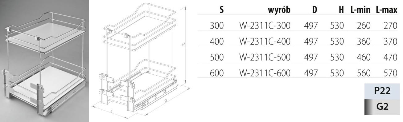 Cargo mini BLUM, 300mm, 2 półki, P22 efekt chromu