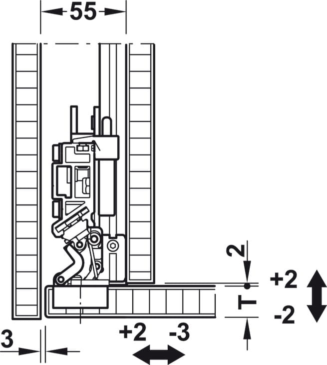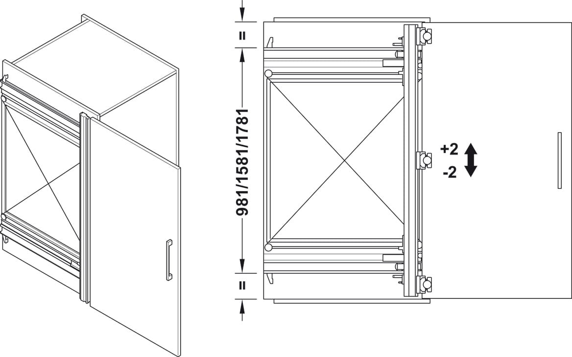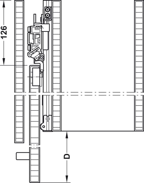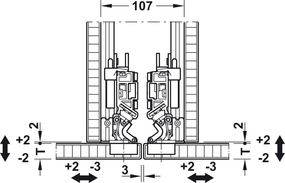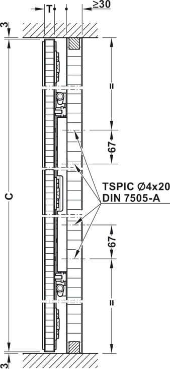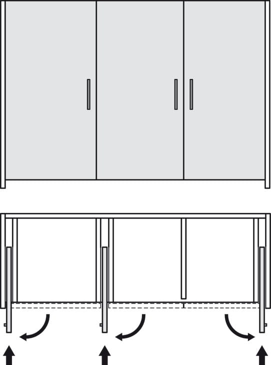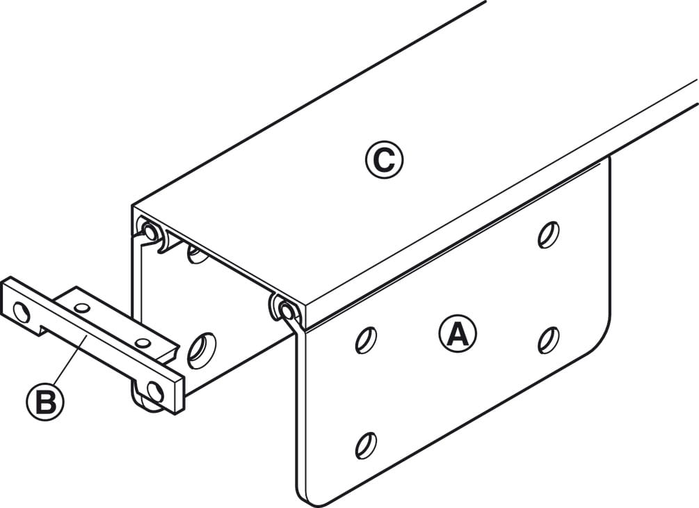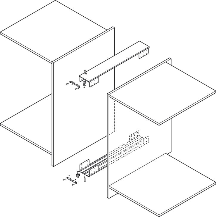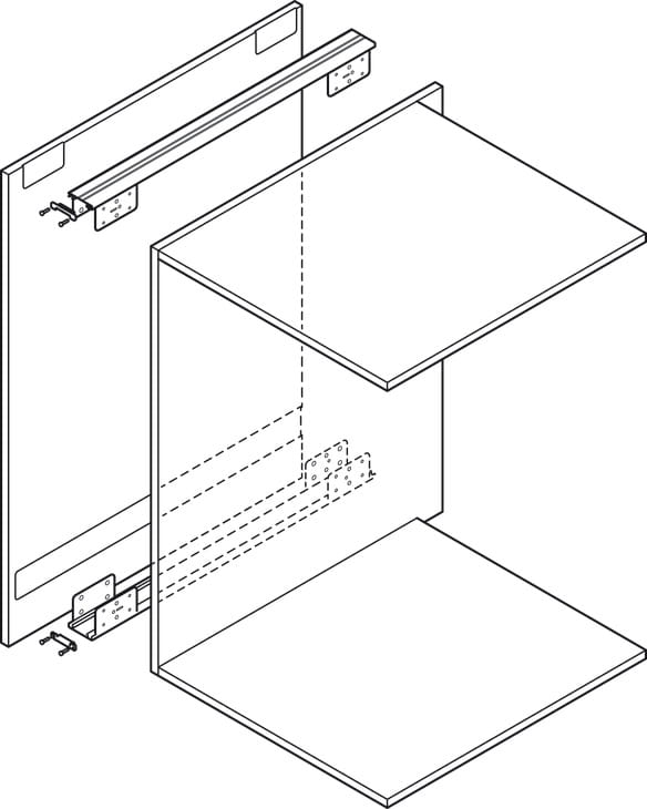 - Wskazówka do montażu: W konstrukcjach Infront musi istnieć możliwość zdemontowania ścianki bocznej w celu zamontowania okuć, np. ze złączem klinowym nr art. 261.30.117 w połączeniu z kątownikiem do ścianek tylnych nr art. 264.24.706.