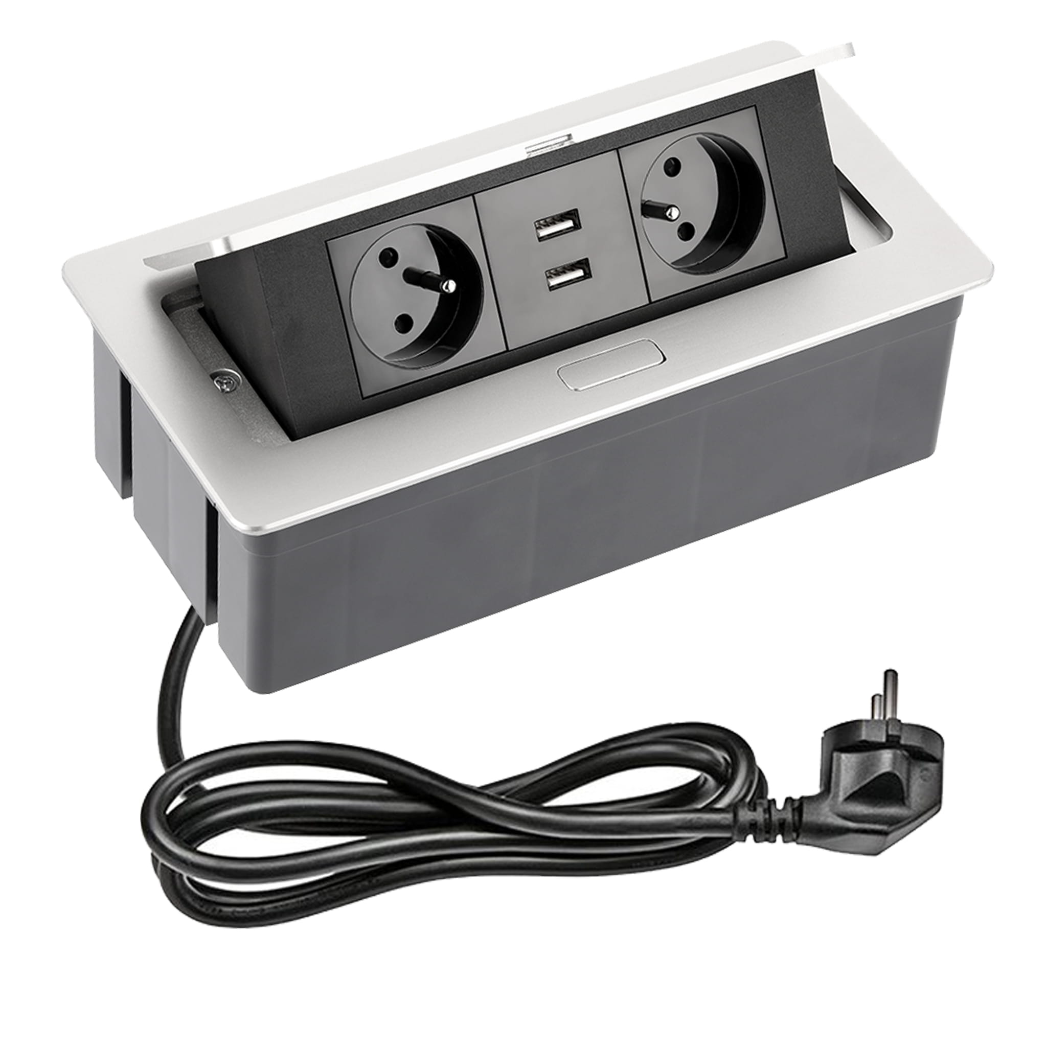 Gniazdo Przedłużacz SOFT biurkowy wpuszczany prostokątny 2 gniazda z bolcem + 2 x USB 2,1A, 1,5m, srebrny