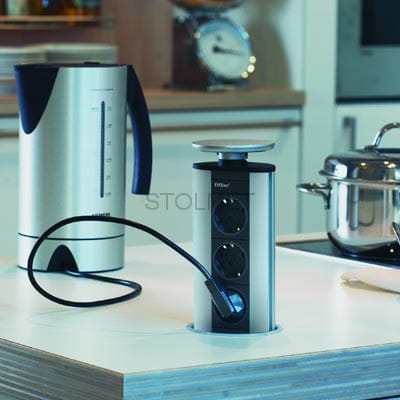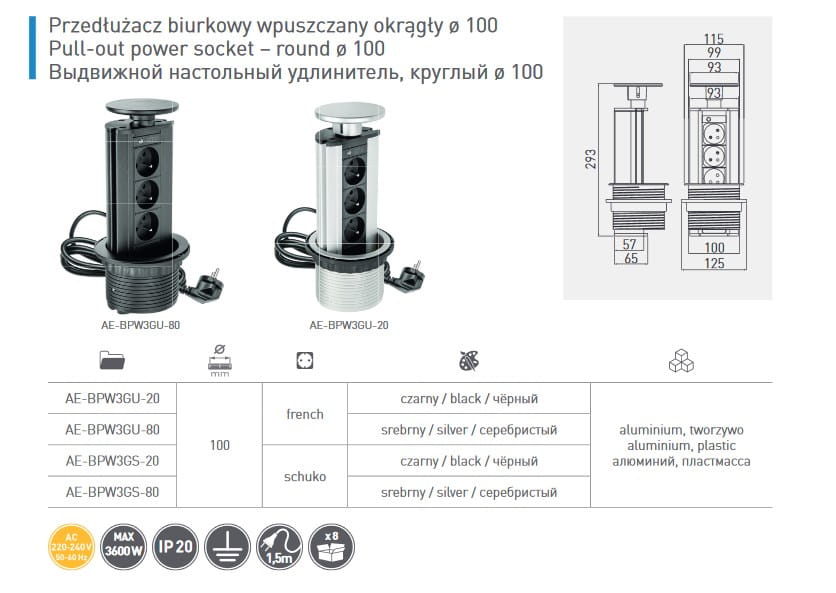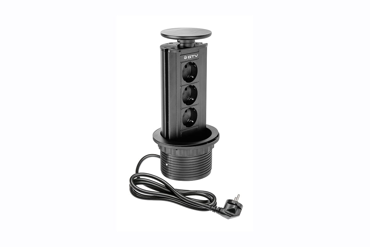 Gniazdo Przedłużacz biurkowy wpuszczany, 3 gniazda, fi 100, Czarny