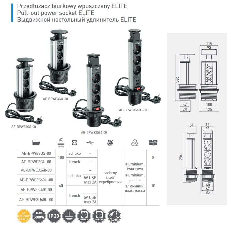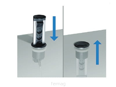 Przedłużacz wpuszczany GTV to idealne rozwiązanie do mebli biurowych oraz domowych które pozwoli na wbudowanie do konstrukcji mebla gniazdek elektrycznych. Stylowy, wykonany z wysokiej jakości tworzywa oraz metalu doda prestiżu oraz nowoczesności Państwa meblom. Zasilacz posiada wbudowane 3 gniazdka elektryczne wysuwane do góry po lekkim naciśnięciu okrągłej pokrywy. Dzięki swojej budowie przedłużacze z linii ELITE pozwalają na dostosowanie powłoki pokrywy wedle Państwa zapotrzebowaniom. W Naszej ofercie dostępne są dwa kolory pokrywki - dodający nowoczesności chrom oraz inox szykowna stal szczotkowana.