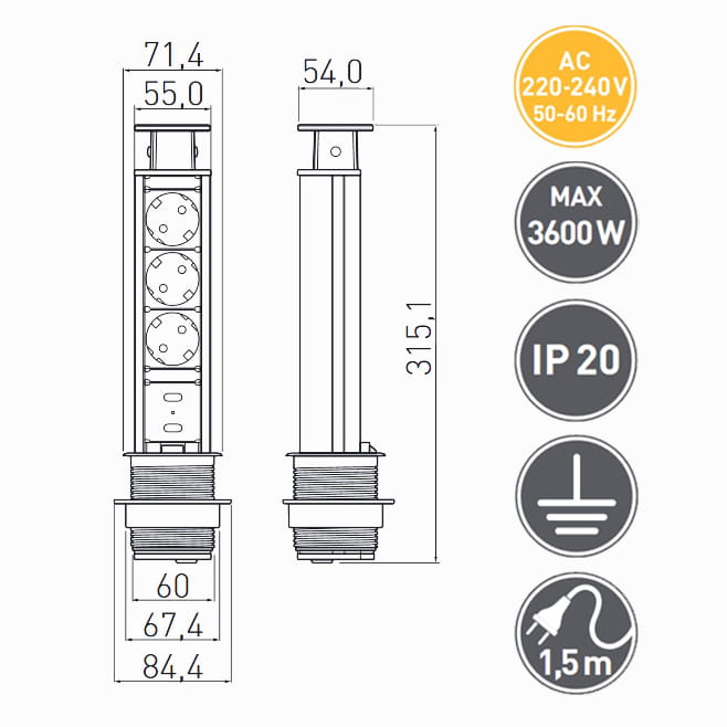 60mm, 3x gniazdo z uziemieniem, 2x gniazdo USB