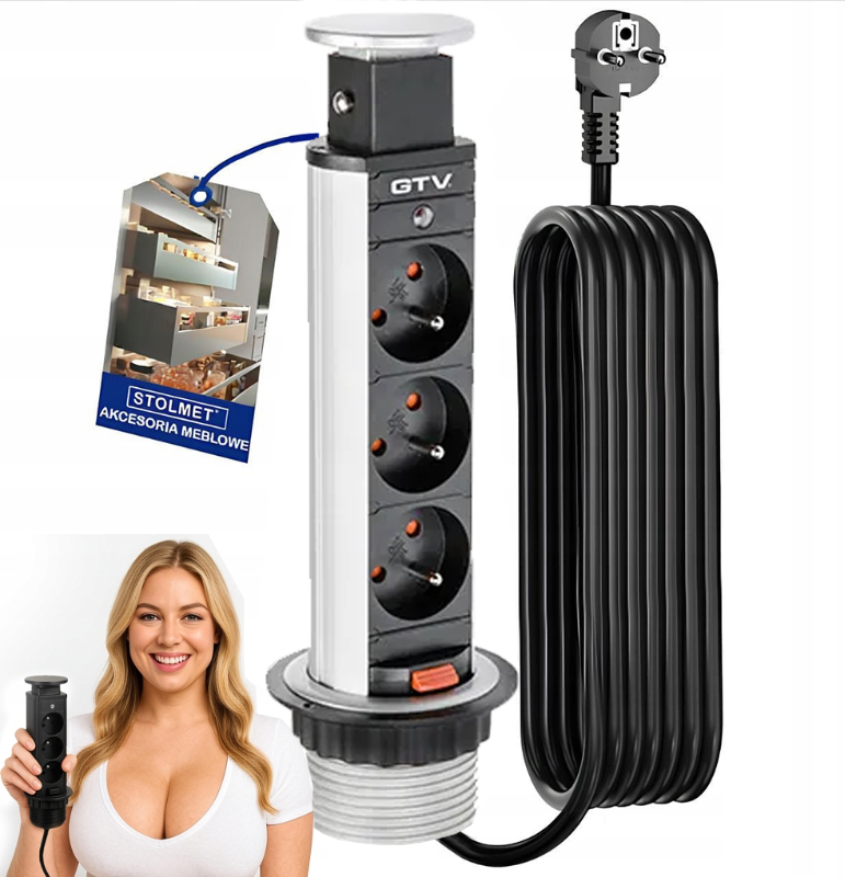 Gniazdo Przedłużacz biurkowy wysuwany, srebrny, fi 60, 3 gniazda, włącznik