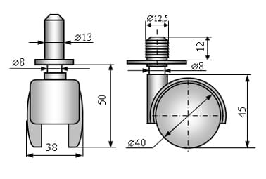 Kółko meblowe obrotowe fi40, trzpień fi8 + mufa