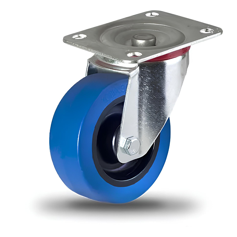 Koło tworzywowe o bieżniku z niebieskiej elastycznej gumy na łożysku rolkowym. Zestawy przeznaczone do skrzyń transportowych oraz innych zastosowań. Wysoka odporność na zużycie i rozdarcia. Nadaje się do zastosowań wewnętrznych i zewnętrznych. Nie pozostawia śladów na podłożu.