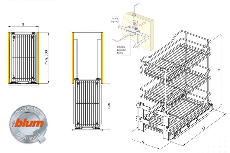 Kosz Cargo, 3 półki, 500mm, P22 efekt chromu, dolny montaż BLUM