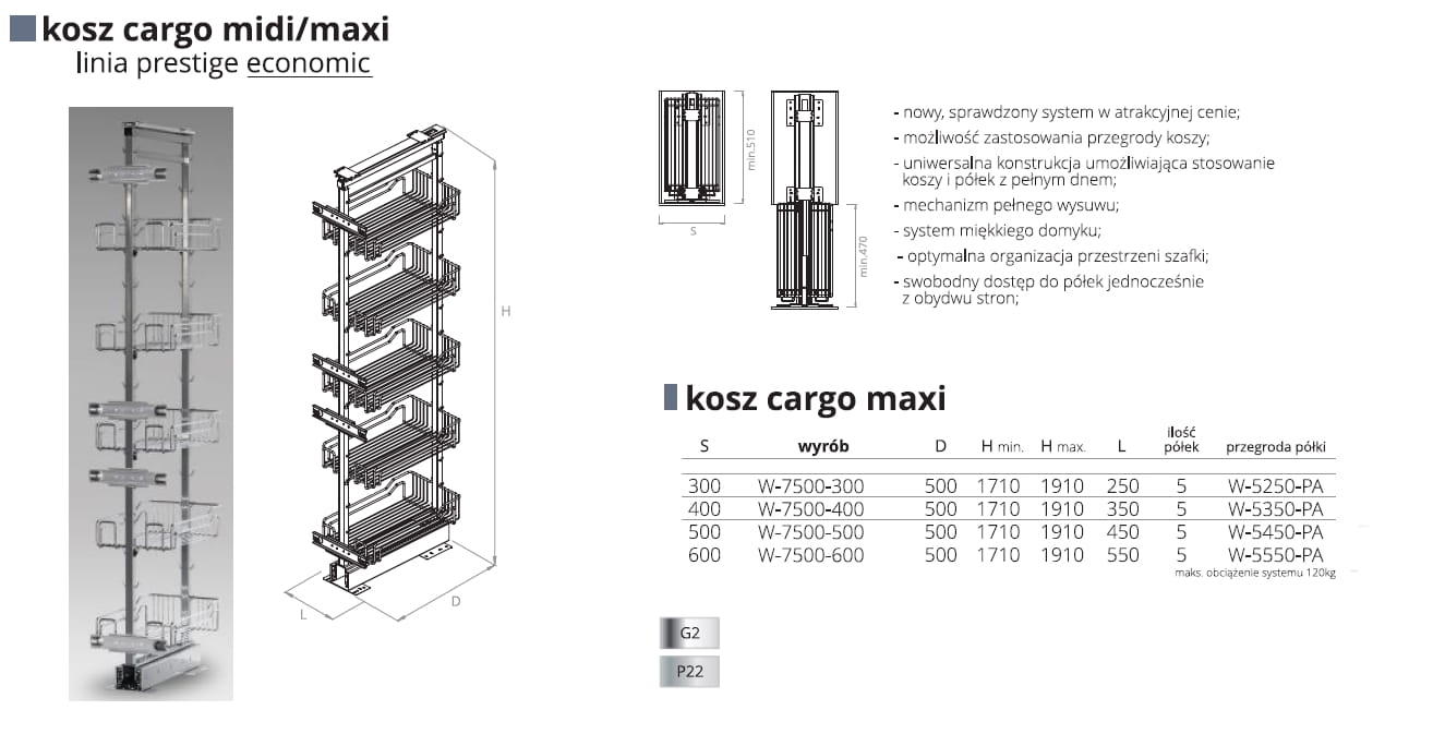 Kosz Cargo MAXI, 300mm, 5 półek, P22 efekt chromu, H-1710-1910mm linia prestige economic