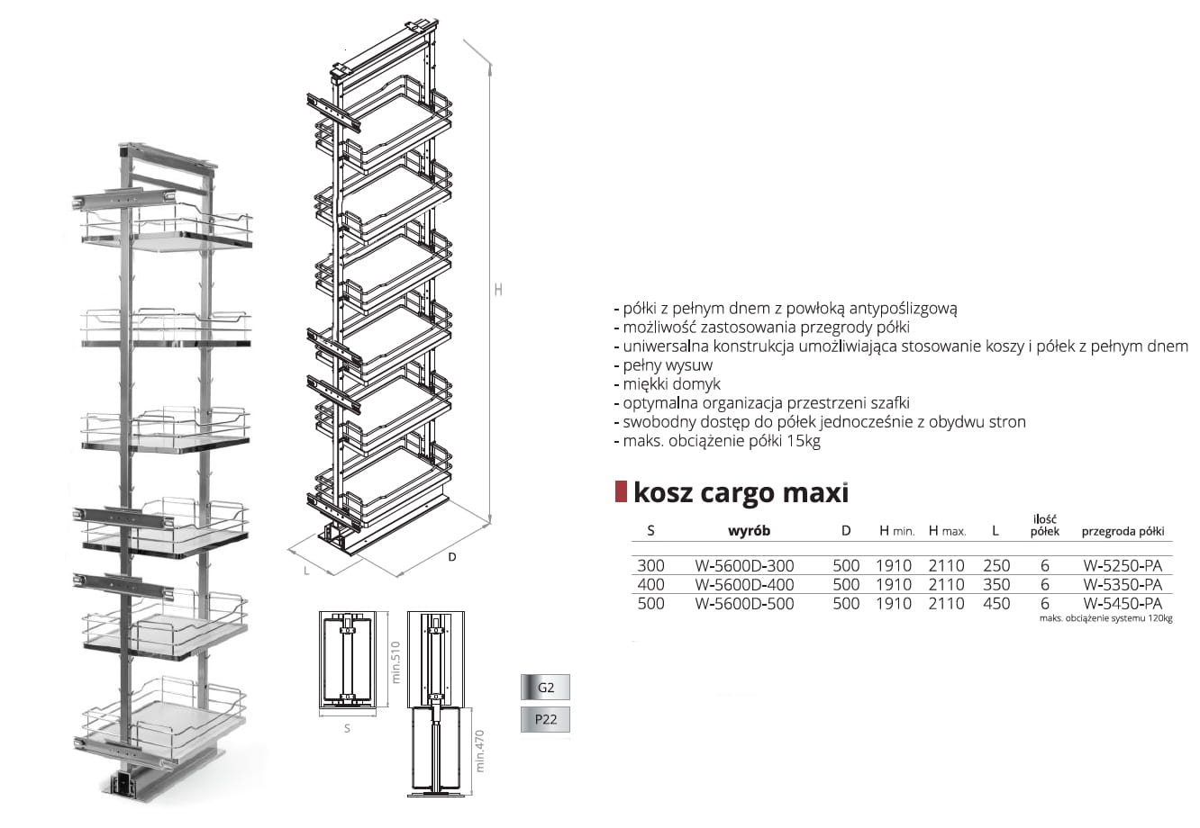 Kosz Cargo MAXI, 400mm, 6 półek, G2 chrom, H-1910-2110mm, pełne dno, powłoka antypoślizgowa