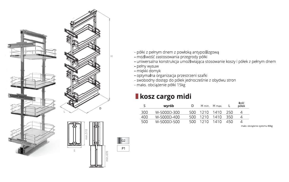 - uniwersalna konstrukcja umożliwiająca stosowanie koszy i półek z pełnym dnem