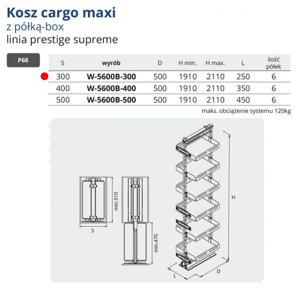 Kosz cargo maxi to świetne i nowoczesne rozwiązanie aby w niezwykle funkcjonalny sposób zagospodarować miejsce wewnątrz zabudowy meblowej. 6 półek i udźwig całkowity wynoszący aż 120 kg pozwala na swobodne umieszczanie w nim nawet ciężkich przedmiotów.