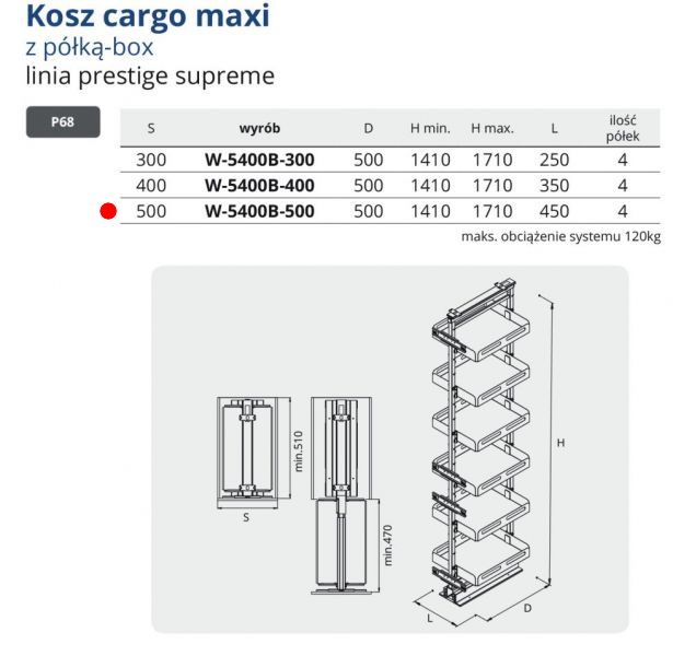Kosz cargo maxi to świetne i nowoczesne rozwiązanie aby w niezwykle funkcjonalny sposób zagospodarować miejsce wewnątrz zabudowy meblowej. 4 półki i udźwig całkowity wynoszący aż 120 kg pozwala na swobodne umieszczanie w nim nawet ciężkich przedmiotów.