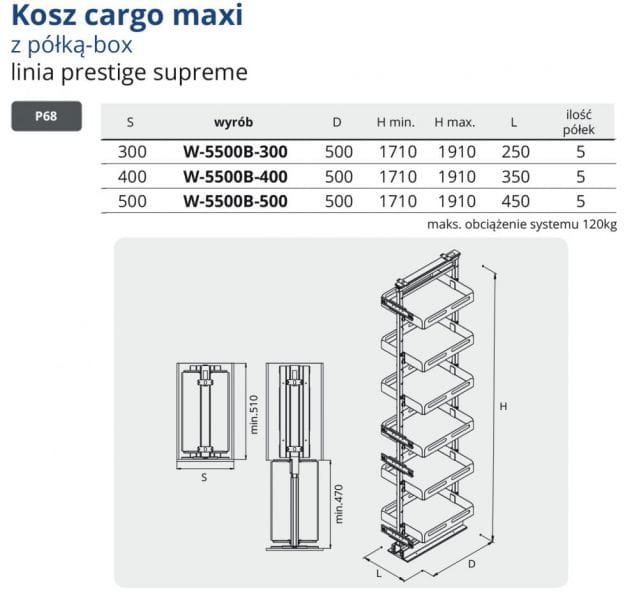 Kosz cargo maxi to świetne i nowoczesne rozwiązanie aby w niezwykle funkcjonalny sposób zagospodarować miejsce wewnątrz zabudowy meblowej. 5 półek i udźwig całkowity wynoszący aż 120 kg pozwala na swobodne umieszczanie w nim nawet ciężkich przedmiotów.