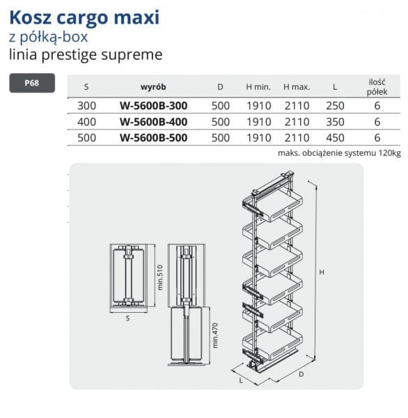 Kosz cargo maxi to świetne i nowoczesne rozwiązanie aby w niezwykle funkcjonalny sposób zagospodarować miejsce wewnątrz zabudowy meblowej. 6 półek i udźwig całkowity wynoszący aż 120 kg pozwala na swobodne umieszczanie w nim nawet ciężkich przedmiotów.