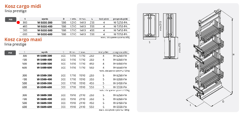 Kosz cargo midi to świetne i nowoczesne rozwiązanie aby w niezwykle funkcjonalny sposób zagospodarować miejsce wewnątrz zabudowy meblowej. 4 półki i udźwig całkowity wynoszący aż 80 kg pozwala na swobodne umieszczanie w nim nawet ciężkich przedmiotów.
