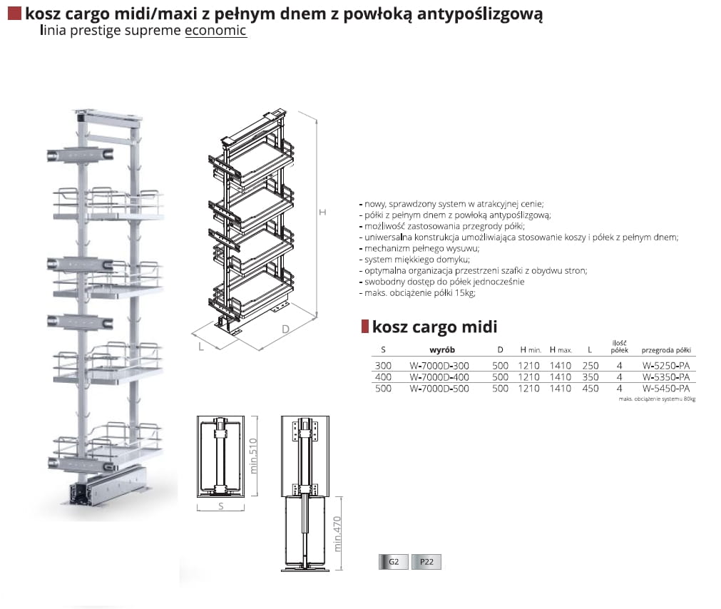 - uniwersalna konstrukcja umożliwiająca stosowanie koszy i półek z pełnym dnem