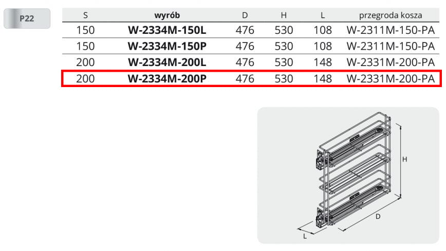 Kosz Cargo boczny prawy 200 mm, linia PRO, 3 półki, regulacja 3D