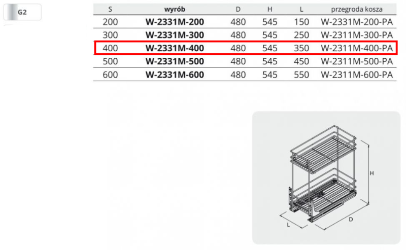 Kosz Cargo 400 mm, linia PRO, 2 półki, regulacja frontu w 3 płaszczyznach