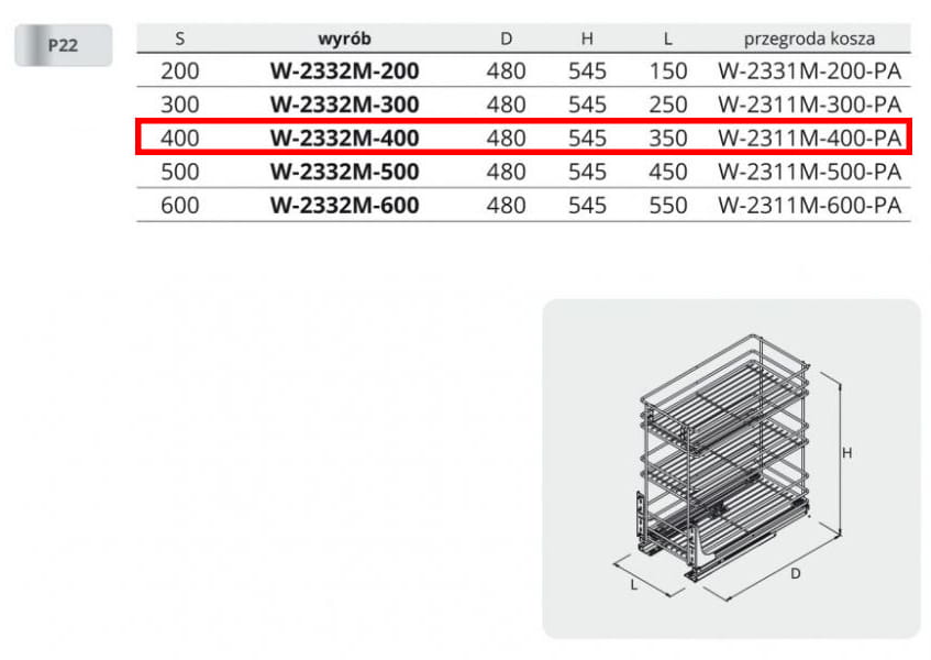 Kosz Cargo 400 mm, linia PRO, 3 półki, regulacja frontu w 3 płaszczyznach