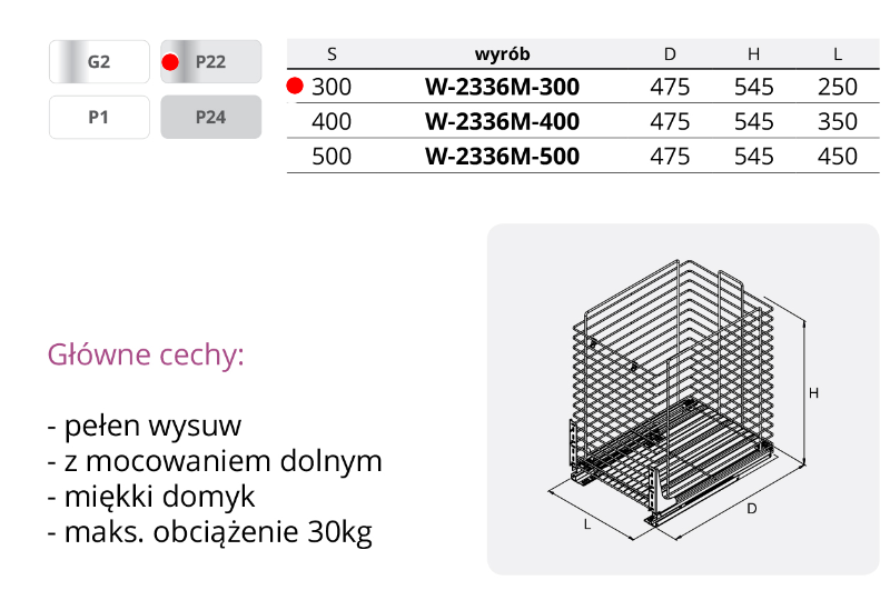 Kosz Cargo jednopoziomowy, linia PRO, regulacja frontu w 3 płaszczyznach