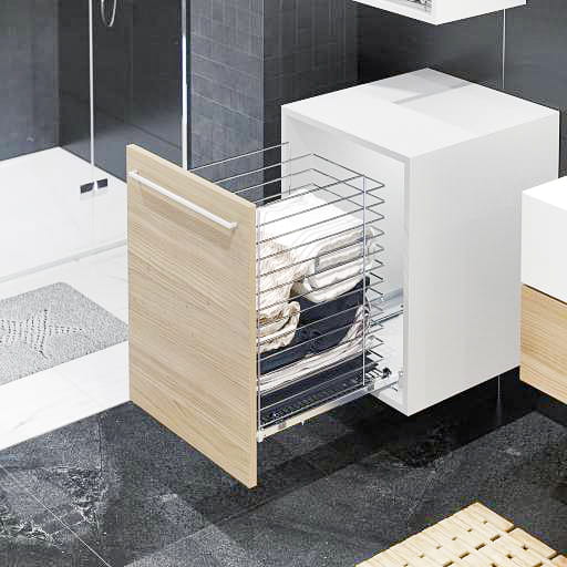 Kosz Cargo do szafki o szerokości zewnętrznej 50 cm. Grube pokrycie powłoki zabezpiecza kosz przed korozją i izoluje przed kontaktem z żywnością. Przednie mocowanie frontu powoduje, że montaż i jego ustawienie pozostaje niezwykle proste. Dodatkowa regulacja w 3 płaszczyznach pozwala na szybkie dopasowanie frontu (regulacja położenia w: Wysokości, szerokości oraz kąta nachylenia)