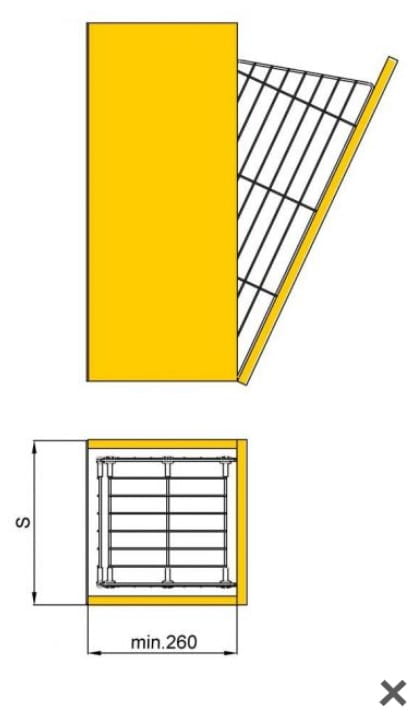 Montaż złożonego kosza odbywa się z użyciem 2 zawiasów nakładanych na dole szafki oraz ograniczników otwarcia (ograniczniki i zawiasy do nabycia osobno)