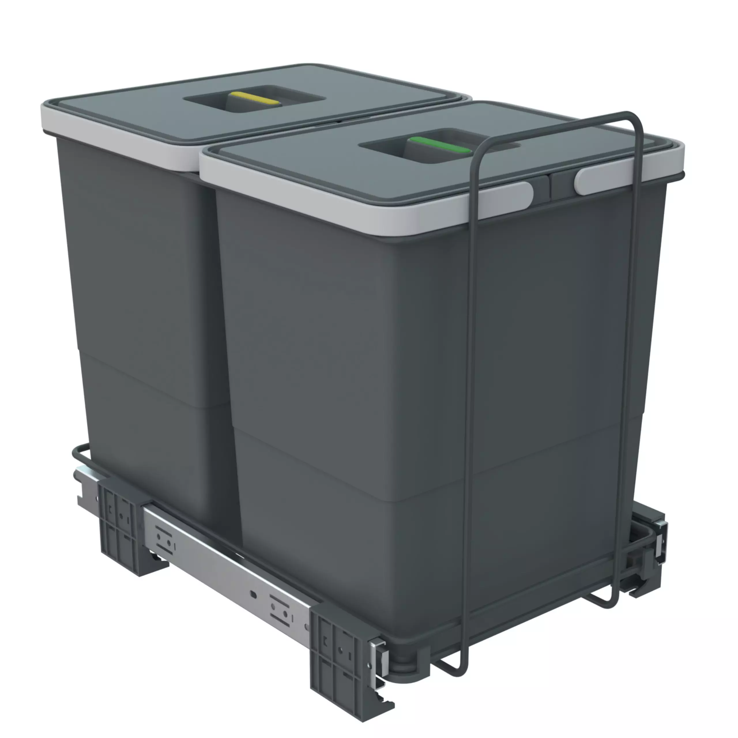 Sortownik na śmieci ECOFIL posiada 2 pojemniki na śmieci, z których każdy ma pojemność 18 litrów. Ten nowoczesny kosz pozwoli Ci na wygodną segregację odpadów. Sortownik wysuwa się na prowadnicach typu kulkowego. Gwarantuje to ciche i płynne wysuwanie się całego kosza z sortownikami. Dwa kosze posiadają pokrywy z uchwytami w dwóch kolorach: czerwonym i żółtym co ułatwia poprawną segregację. Kosze są wykonane z plastiku, który pozwala utrzymać je w odpowiedniej czystości. Montaż jest bardzo łatwy - wystarczy przykręcić stelaż kosza do spodu szafki. Sortownik do szafki na 2 kosze