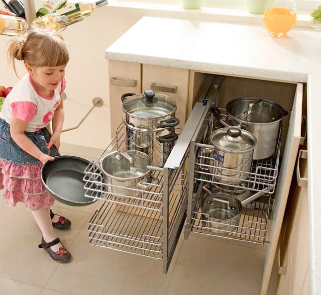 Kosz narożny to świetne i nowoczesne rozwiązanie aby w niezwykle funkcjonalny sposób zagospodarować miejsce wewnątrz szafki narożnej. Dzięki specjalnej budowie z szafki możemy wysunąć cały kosz który oparty na prowadnicach pełnego wysuwu gwarantuje swobodny dostęp do całej przestrzeni wewnątrz szafki.
