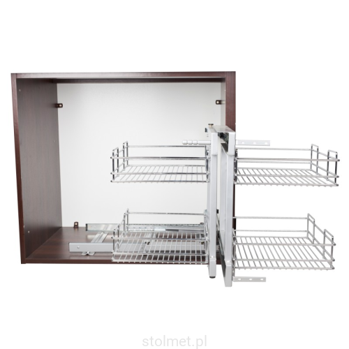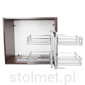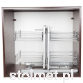 Zastosowanie kosza narożnego w szafce pozwala na spożytkowanie całej przestrzeni szafki narożnej. Wysuwane cargo umożliwia swobodny dostęp do koszy.