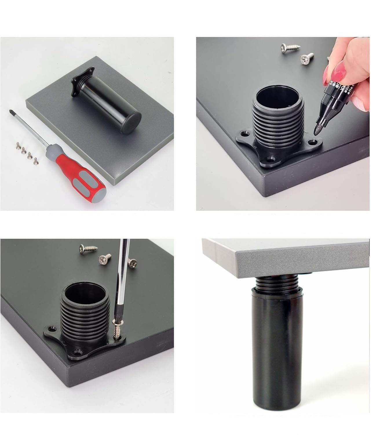 Stylowa nóżka meblowa wykończona w czarnym połysku idealnie wpasowuje się w obecne trendy w branży meblarskiej. Nóżka posiada regulację wysokości, dzięki czemu w bardzo łatwy sposób można wyregulować poziom mebla.