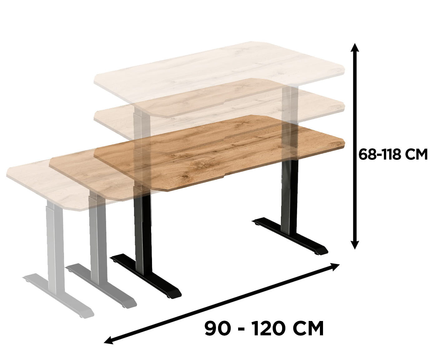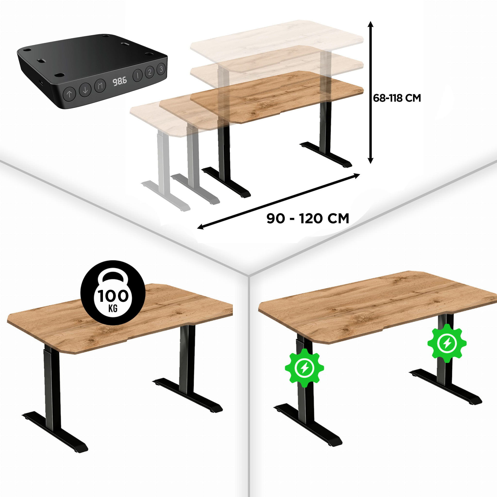 Stelaż do biurek z elektryczną regulacją wysokości w zakresie 685-1180 mm za pomocą zintegrowanego pilota. System pamięci pozwala zaprogramować 3 wysokości w celu wygodnego przełączania między nimi. Możliwość regulacji szerokości (w zakresie 900-1200 mm)