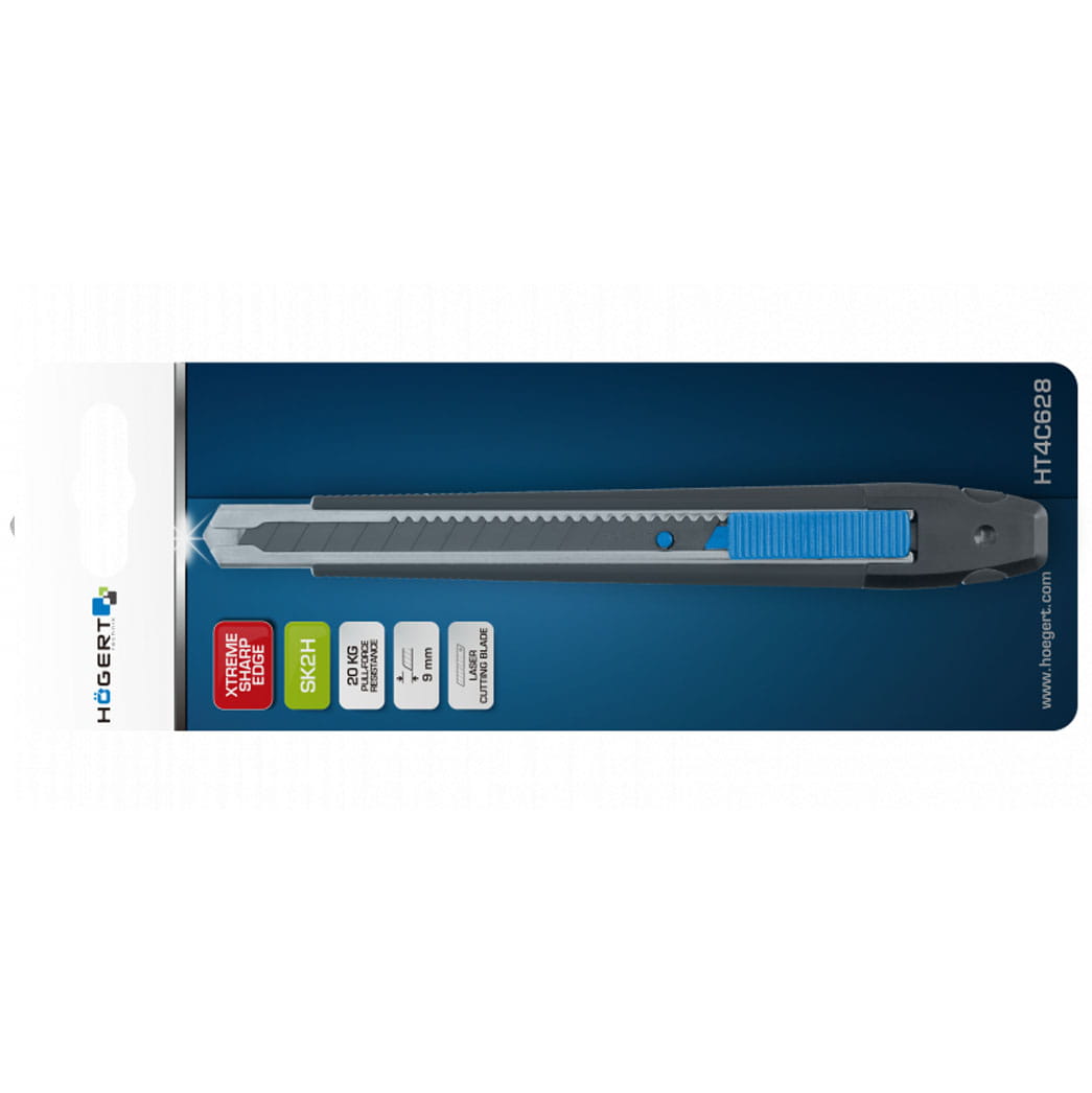 Nóż z ostrzem łamanym, uniwersalnego zastosowania, pomocny przy do wykonywaniu prac wykończeniowych. Przeznaczony szczególnie do cięcia kartonów, tapet, wykładzin, tkanin plandekowych, folii drukarskich oraz folii PVC, itp.