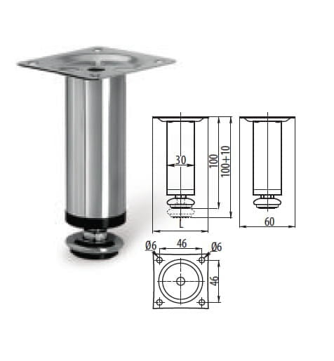 Nóżka meblowa BD-10 z regulacją, chrom połysk, 100 mm + 10 mm. 4 SZT + Wkręty