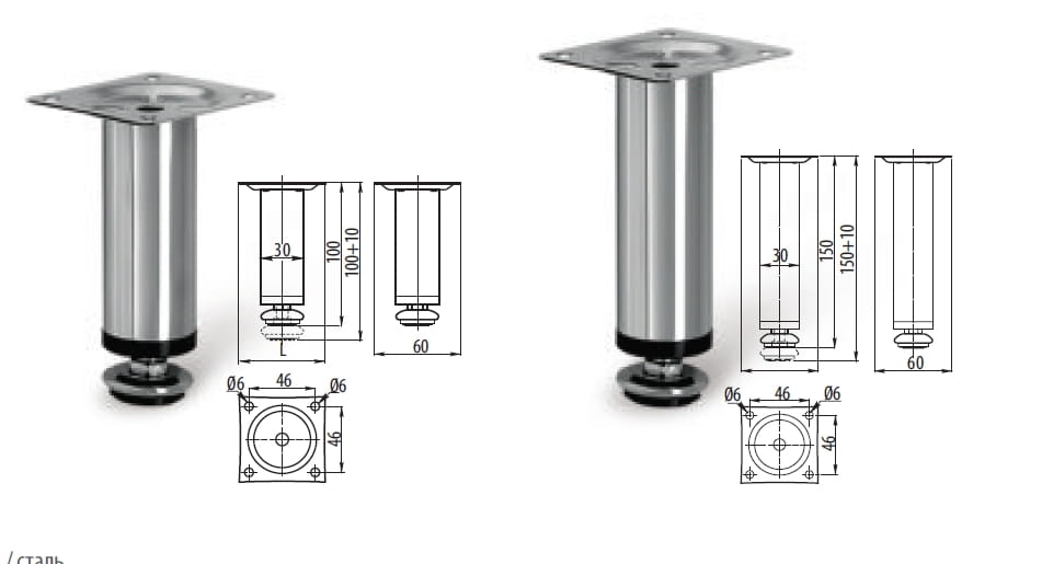Nóżka meblowa BD-15 z regulacją, chrom połysk, 150 mm + 10 mm 4 SZT