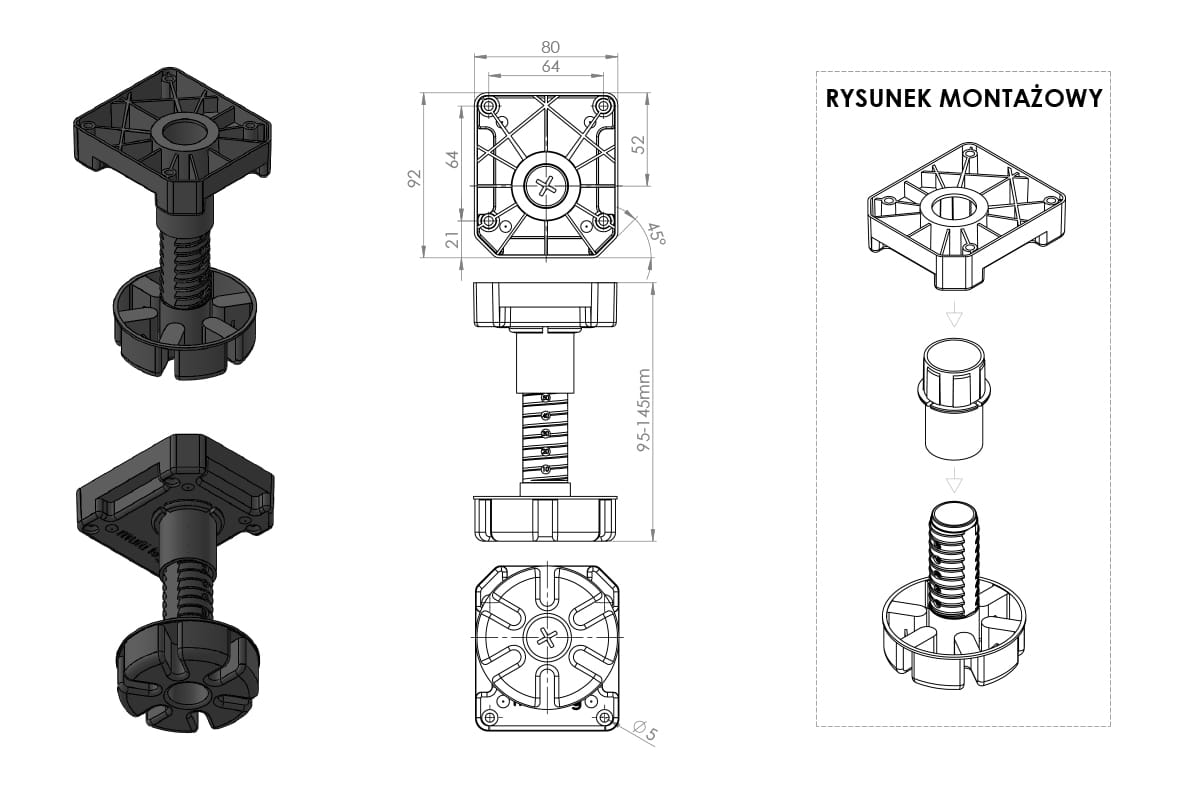 Nóżka wykonana z wytrzymałego tworzywa gwarantuje udźwig 500 kg/nóżkę. Regulacja nóżki odbywa się bardzo płynnie poprzez staranny odlew i dopasowanie elementów. Mocowanie za pomocą 4 wkrętów zapewnia silne połączenie jej do korpusu mebla. Regulacja nóżki zapewnia swobodę przy poziomowaniu mebla.
