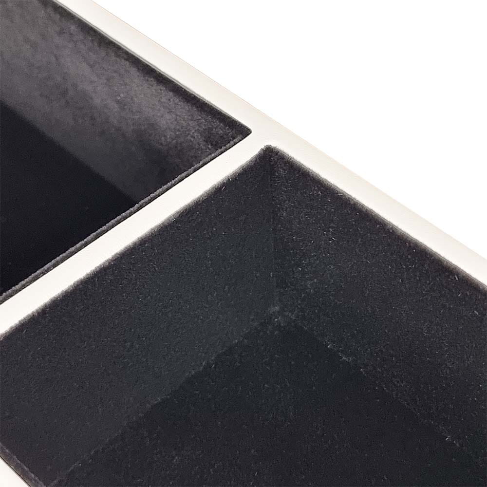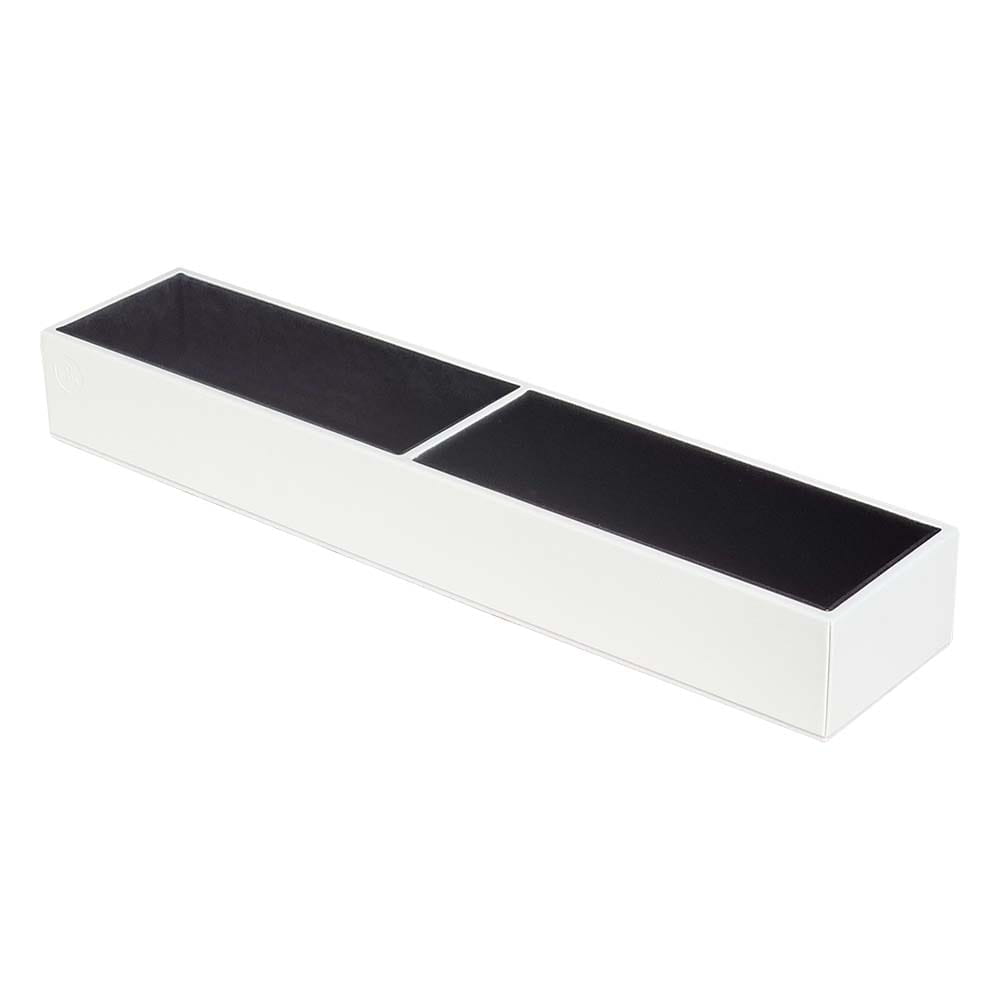 Organizer do szuflad garderobianych C przeznaczony jest do przechowywania akcesoriów garderobianych lub biżuterii. Wkład wykonany jest ze skóry eko w kolorze białym z czarną wyściółką. Szerokość wkładu szufladowego wynosi 100 mm, głębokość 460 mm, wysokość 58 mm.