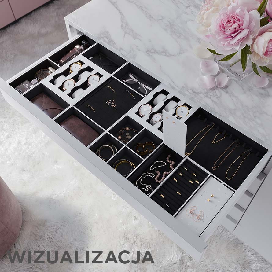 Organizer do szuflad garderobianych C przeznaczony jest do przechowywania akcesoriów garderobianych lub biżuterii. Wkład wykonany jest ze skóry eko w kolorze białym z czarną wyściółką. Szerokość wkładu szufladowego wynosi 520 mm, głębokość 460 mm, wysokość 58 mm.