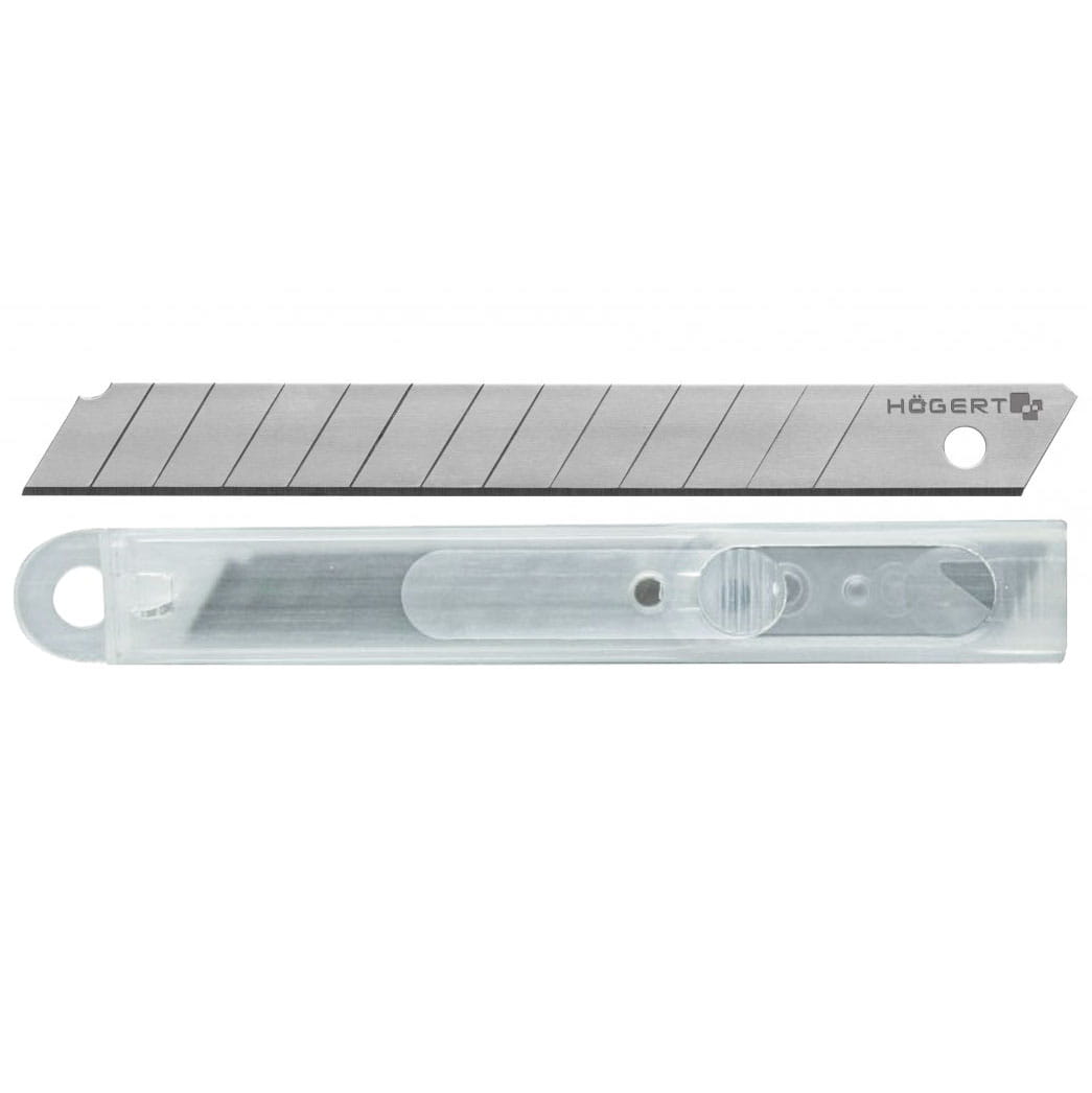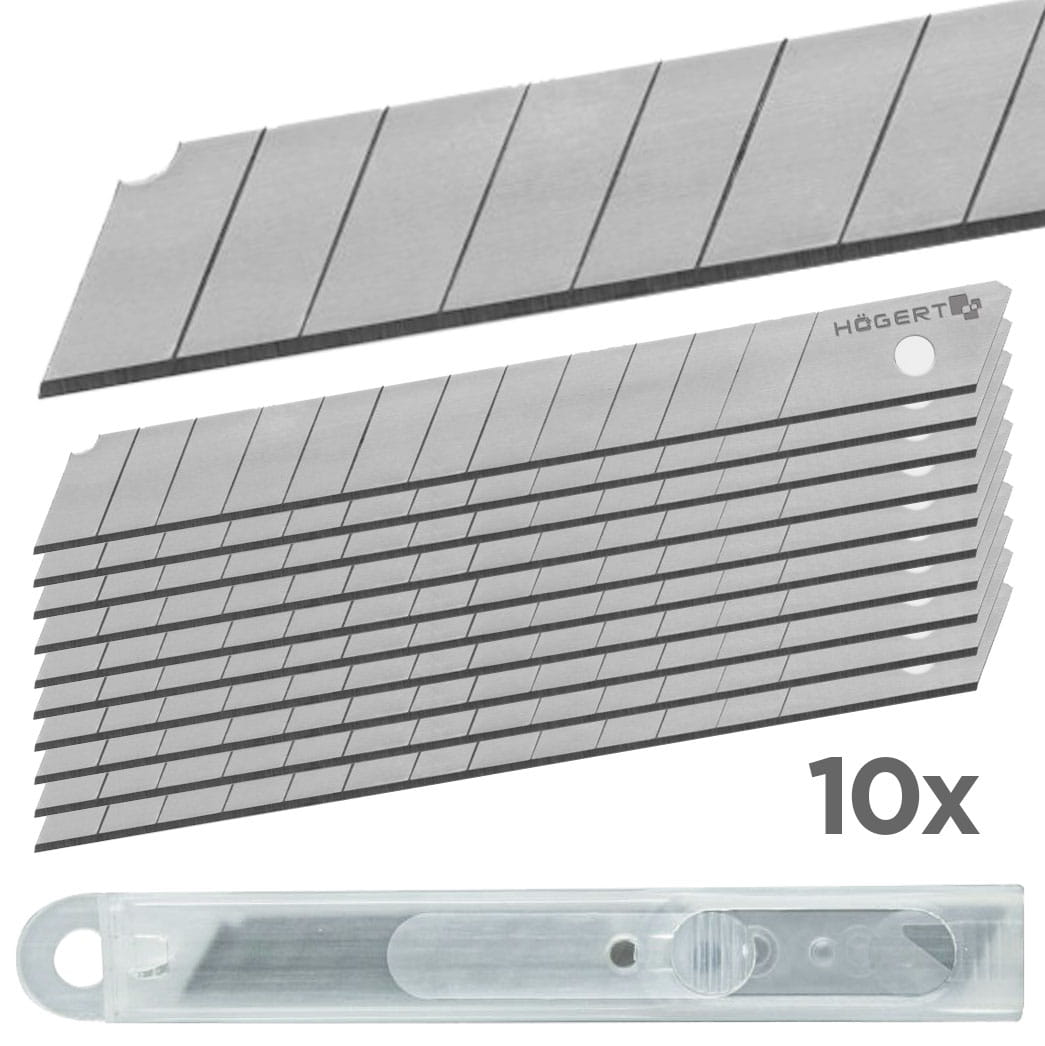 Komplet 10 stalowych ostrzy łamanych stosowanych w nożach wysuwanych. Do cięcia kartonów, tapet, wykładzin, tkanin plandekowych, folii drukarskich oraz folii PCV itp.