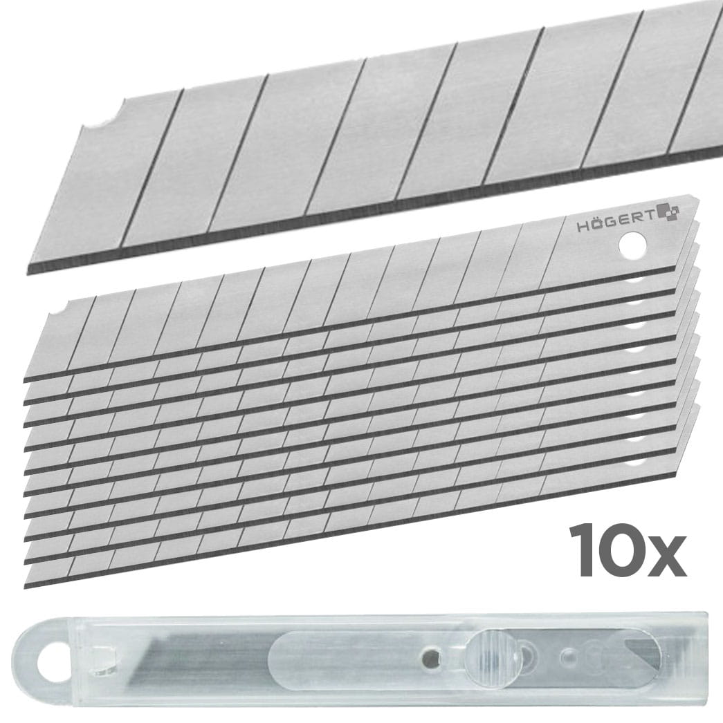 Komplet 10 stalowych ostrzy łamanych stosowanych w nożach wysuwanych. Do cięcia kartonów, tapet, wykładzin, tkanin plandekowych, folii drukarskich oraz folii PCV itp.