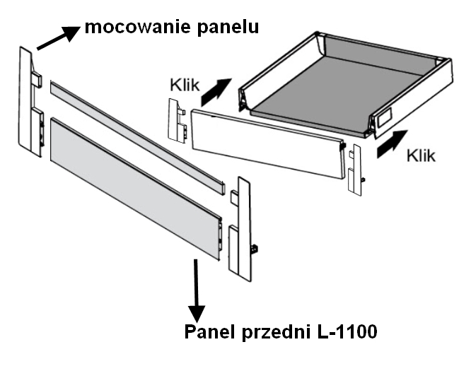 W systemie Modern BOX do szuflady standardowej można wykonać szufladę wewnętrzną. Panel przedni o długości 1100 mm jest jednym z elementów tej szuflady.