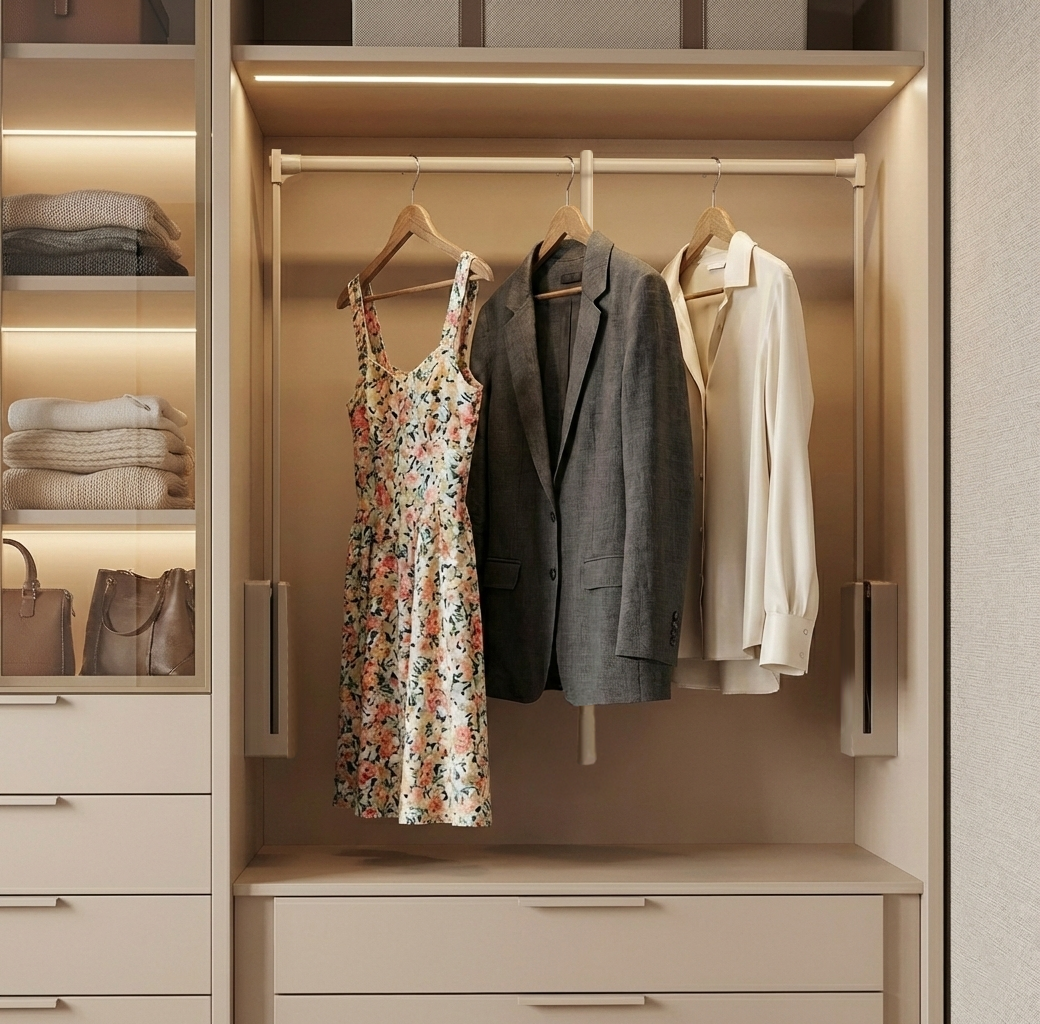 - Szerokość drążka 500-700mm, możliwość dopasowania do wymiarów wewnętrznej przestrzeni szafy.