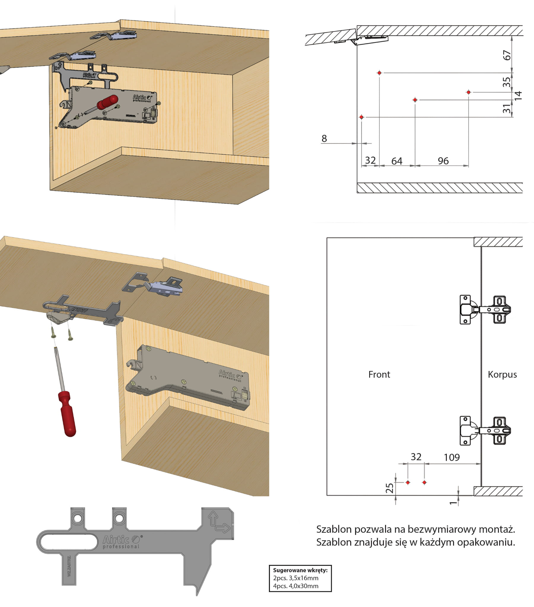 Uniwersalne zastosowanie do wszystkich typów szafek z frontem podnoszonym. Wbudowana regulacja i dociąg końcowej fazy zamykania. Perfekcyjnie współpracuje z bezuchwytowym systemem otwierania typu push. Uniwersalna konstrukcja daje możliwość zastosowania po prawej lub lewej stronie szafki. Podnośnik wykonany z wysokiej jakości tworzywa technicznego