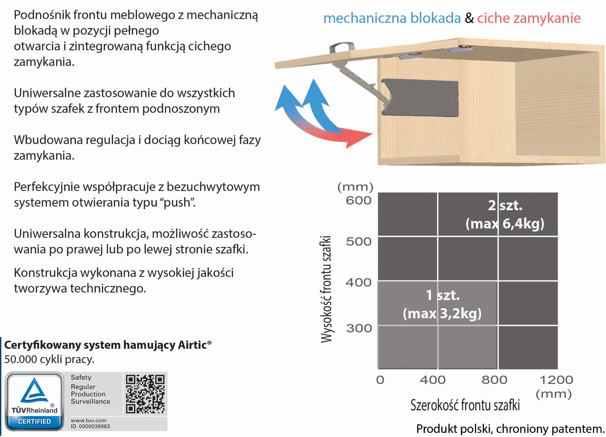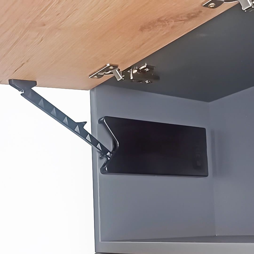Podnośnik frontu meblowego z mechaniczną blokadą w pozycji pełnego otwarcia i zintegrowaną funkcją cichego zamykania.