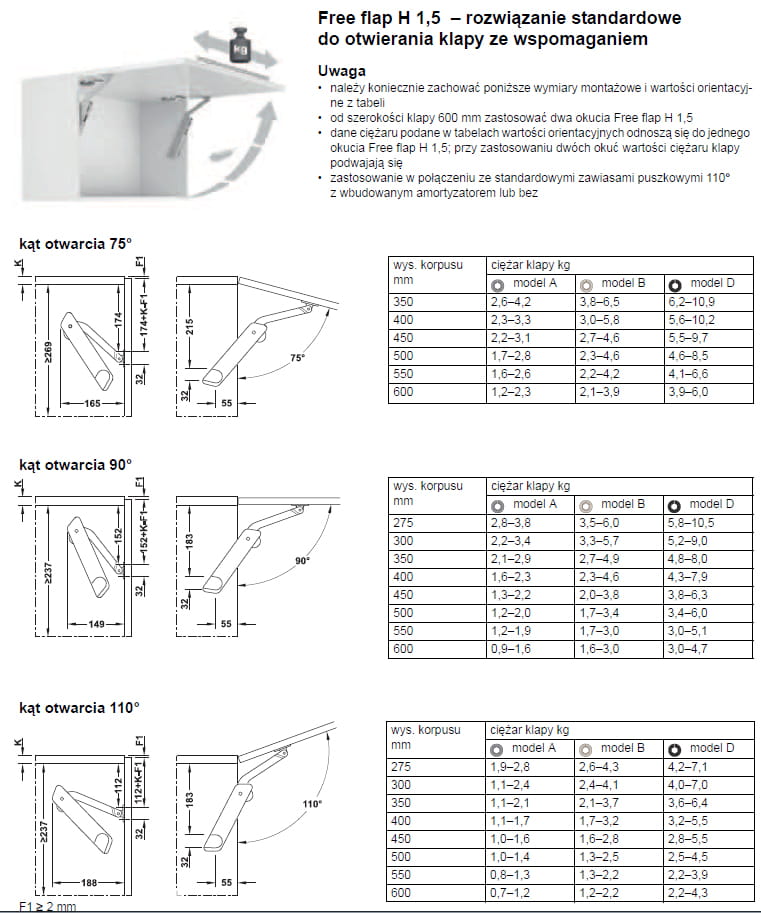 | Minimalna wys. klapy (mm) | 500 - 600 mm |
