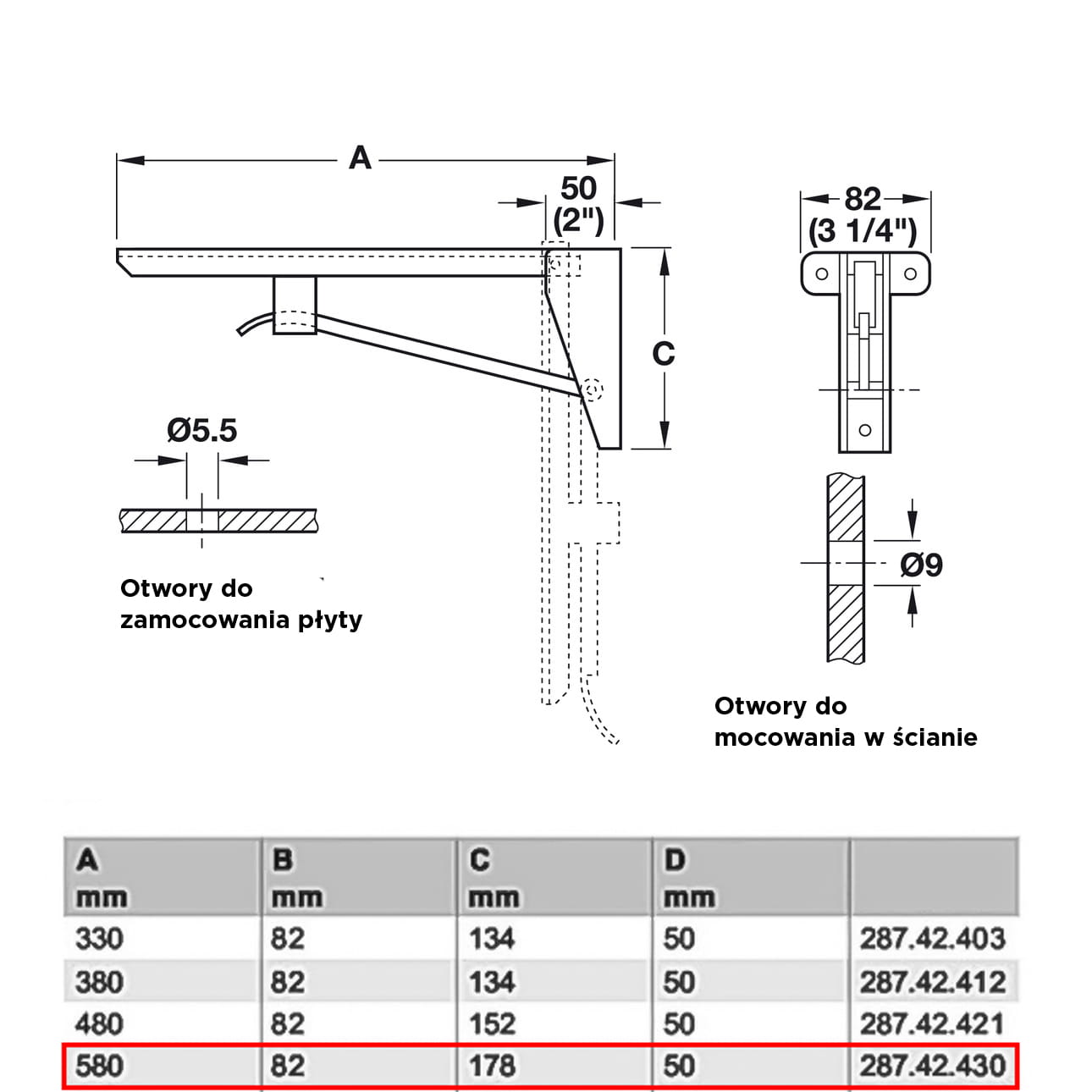 Podpórka pod półkę składana, 580 mm, szary