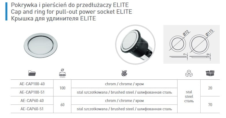 Dzięki swojej budowie przedłużacze z linii ELITE pozwalają na dostosowanie powłoki pokrywy wedle Państwa zapotrzebowaniom. W Naszej ofercie dostępne są dwa kolory pokrywki - dodający nowoczesności chrom oraz inox szykowna stal szczotkowana. Dobierz swój kolor powłoki i dodaj designu swoim meblom!
