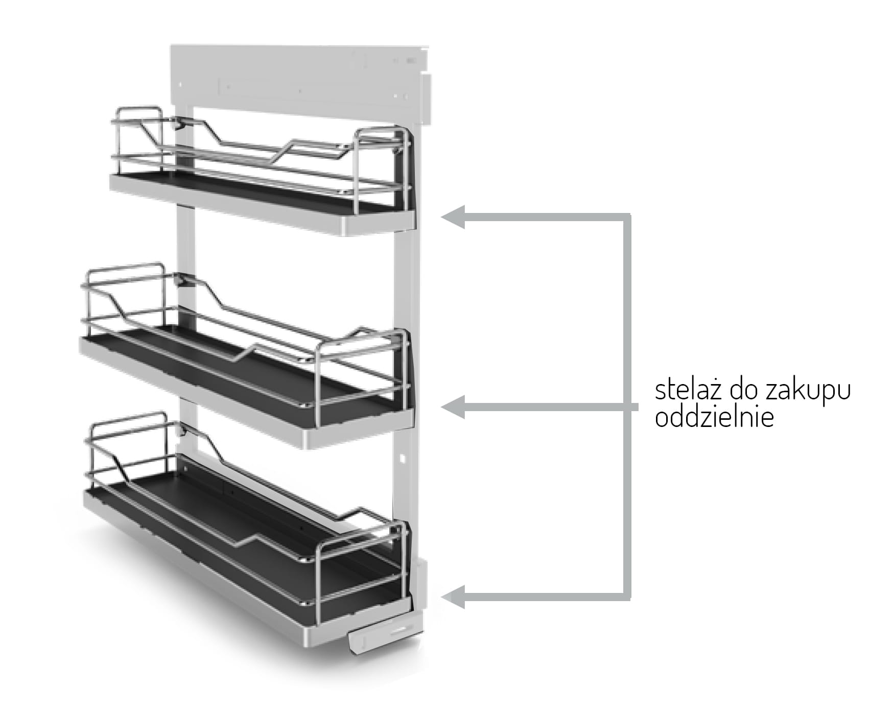 - możliwość dowolnej kompletacji półek w wersji jedno, dwu- lub trzy-poziomowej w szerokościach: 150, 200, 300mm (Idealne rozwiązanie do szafek ze zlewem)