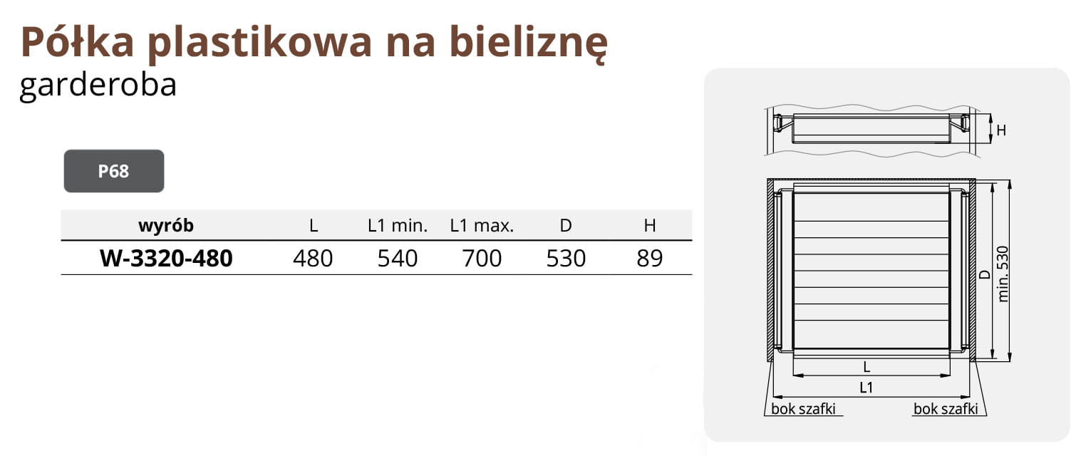 Wykonana z tworzywa półka została dostosowana do praktycznego przechowywania bielizny i odzieży. Prowadnica łożyskowana z pełnym wysuwem gwarantuje łatwy dostęp do całej długości półki oraz jej wieloletnie działanie. Wykonana w kolorze antracytu znakomicie realizuje nowoczesne założenia stylistyczne branży meblarskiej.