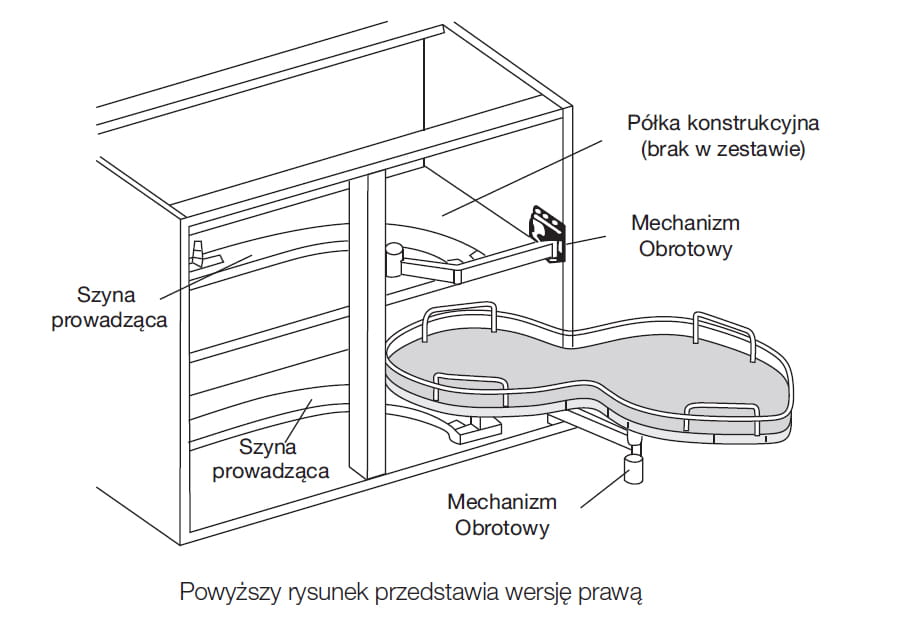 - Montaż: prowadzenie do półki konstrukcyjnej, ramię przykręcane do boku
